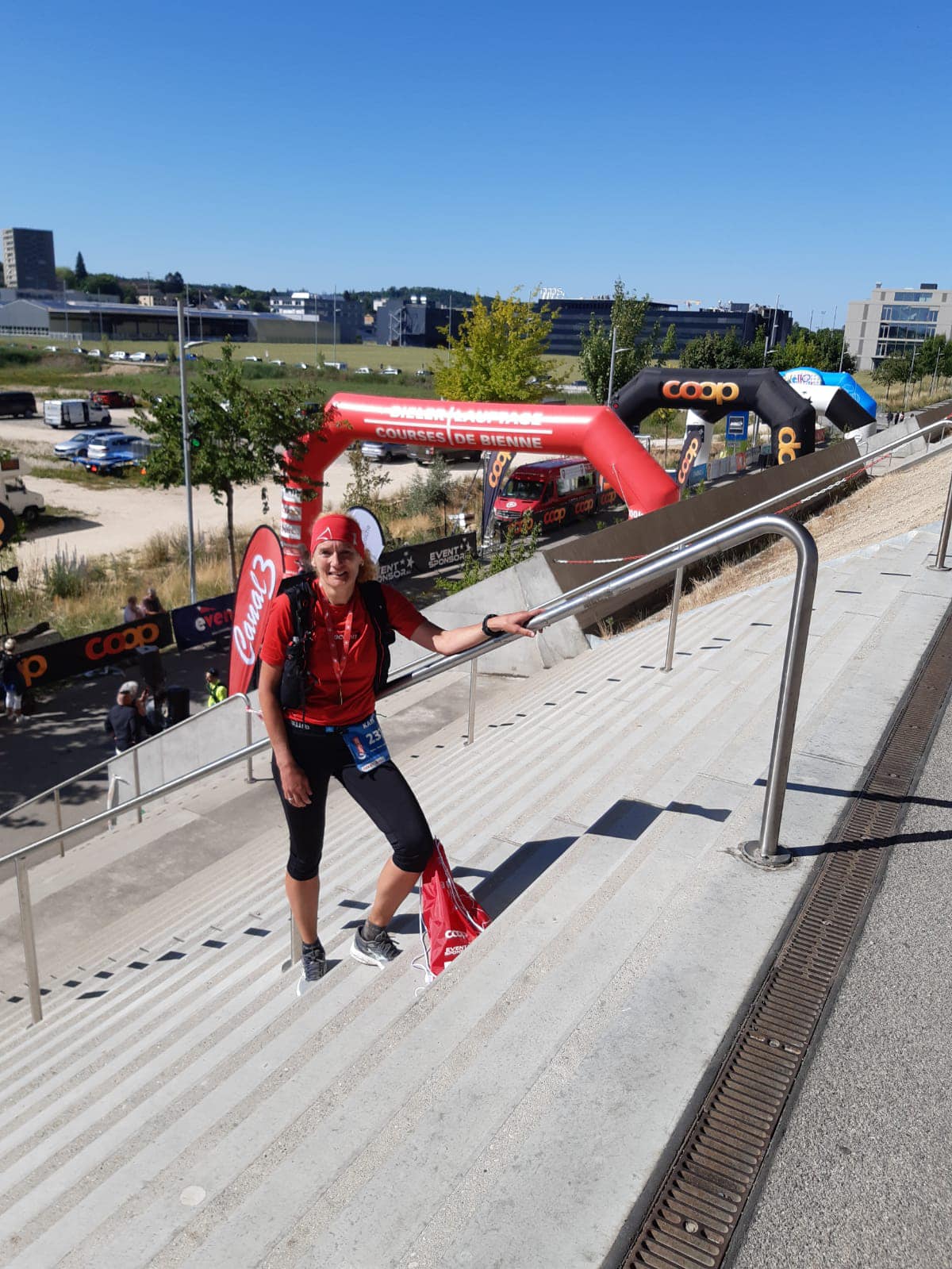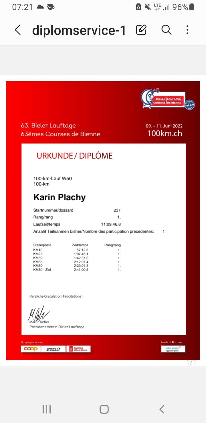 Mit einer Gesamtzeit von 11:09:46 h auf die 100 km erreichte Karin wieder die Bieler Tissot Arena und überquerte als Gesamtneunte überglücklich die Ziellinie. In der Damenliga AK W50 gewann sie mit der beeindruckenden Zeit den 1. Platz von 13 Läuferinnen. Wir ziehen unseren Hut vor dieser Leistung, die sowohl physisch als auch psychisch einiges abverlangt!