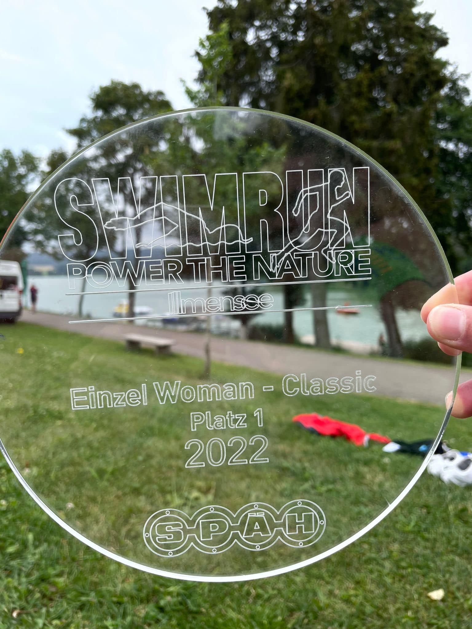 Pünktlich zum Start hörte es auf zu regnen, sodass die SportlerInnen bei traumhaften Witterungsbedingungen und 25 Grad Wassertemperatur starten konnten. Auf den zwei Runden um den Illmensee wird insgesamt 8x geschwommen und 9x gelaufen, sodass insgesamt 12,2 km zu Fuß und 3,8km im Wasser zurückgelegt werden.