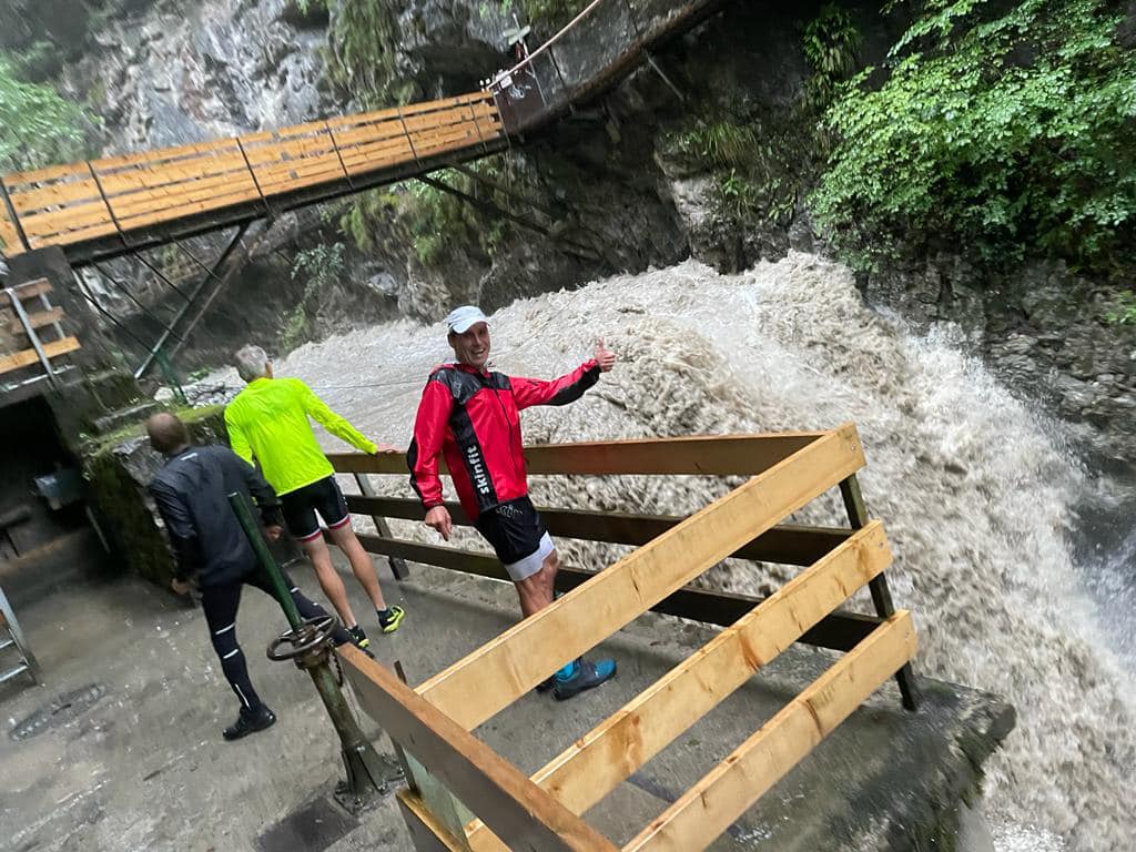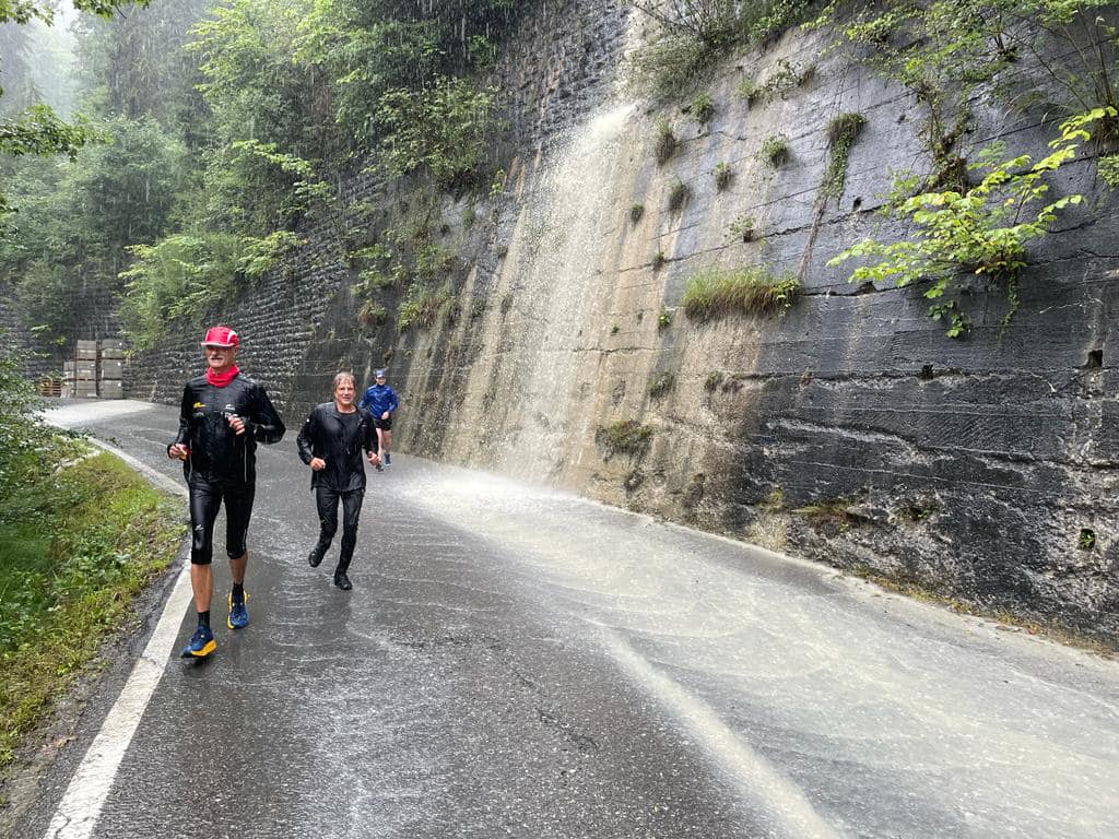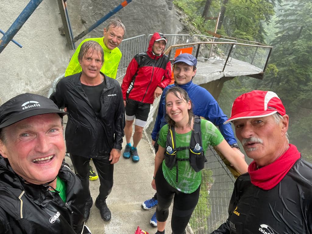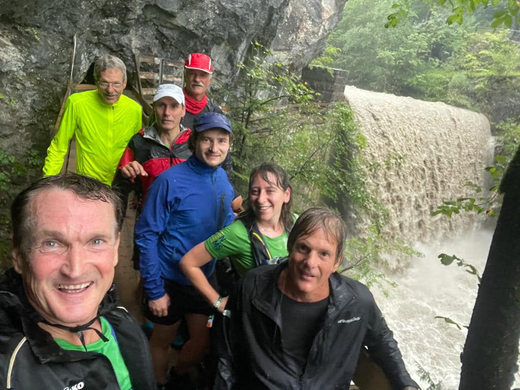 Aufgrund der gewaltigen Wassermassen musste kurzfristig nochmal umgeplant werden und so führte Thijs die wetterfesten Läuferinnen und Läufer von der Karren Talstation ins Gütle, und von dort aus über den Wassermännle-Steig zu der Spätenbachalpe. In der Rappenlochschlucht flossen gewaltige Wassermassen durch.