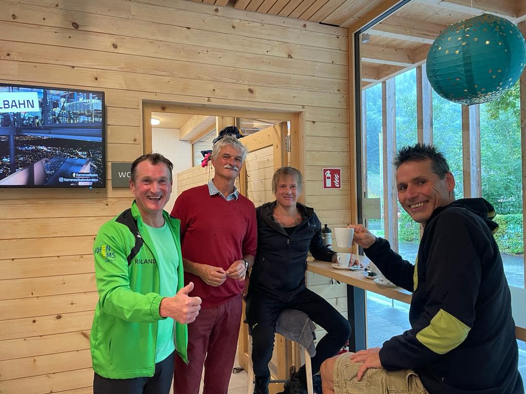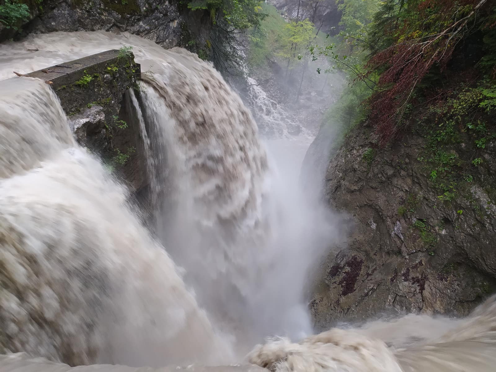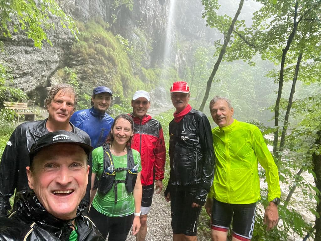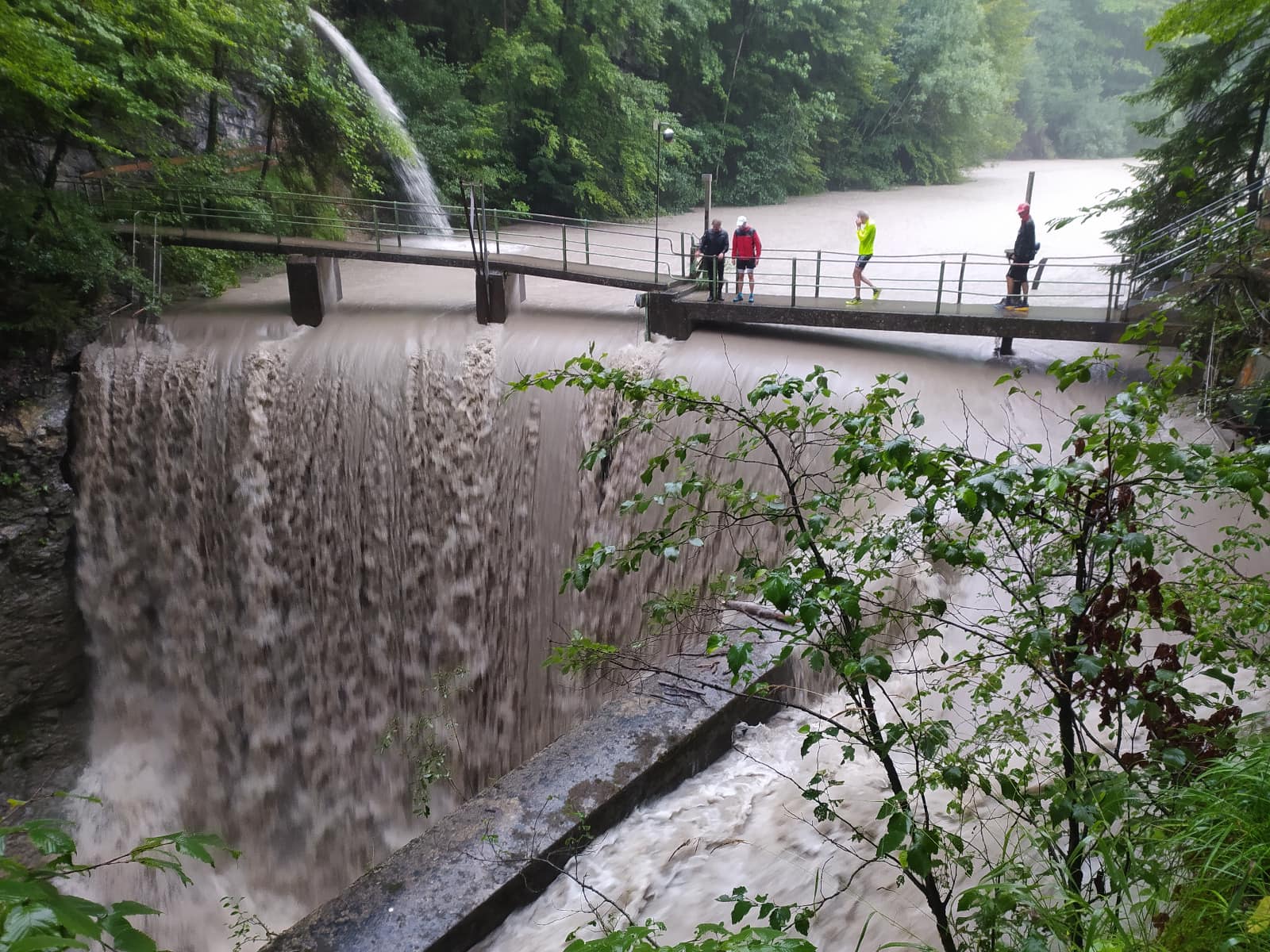 Aufgrund der gewaltigen Wassermassen musste kurzfristig nochmal umgeplant werden und so führte Thijs die wetterfesten Läuferinnen und Läufer von der Karren Talstation ins Gütle, und von dort aus über den Wassermännle-Steig zu der Spätenbachalpe. In der Rappenlochschlucht flossen gewaltige Wassermassen durch.