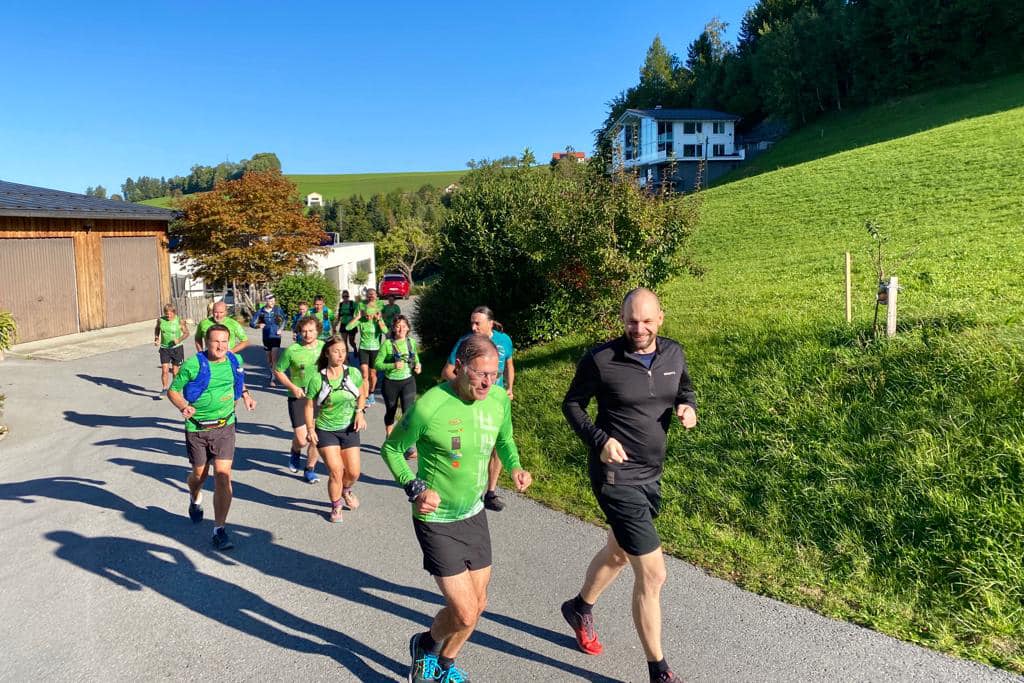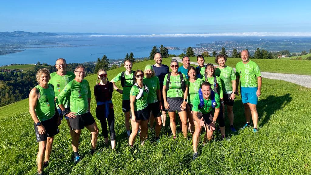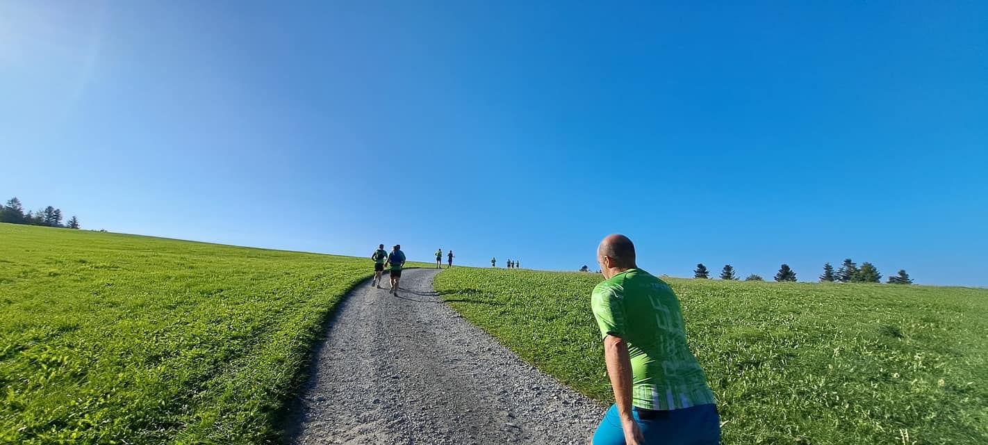 Diesen Monat war es Roland, der den Samstagslauf für uns organisierte. Mit den Autos fuhren wir bis Eichenberg-Lutzenreute, von wo aus die Tour startete. Bei schönstem Sonnenschein mit fast sommerlichen Temperaturen ging es direkt mit einem Anstieg Richtung Fesslerhof hoch zum Hochberg.