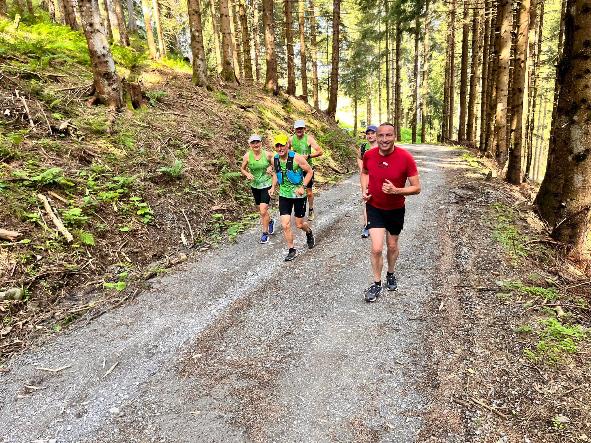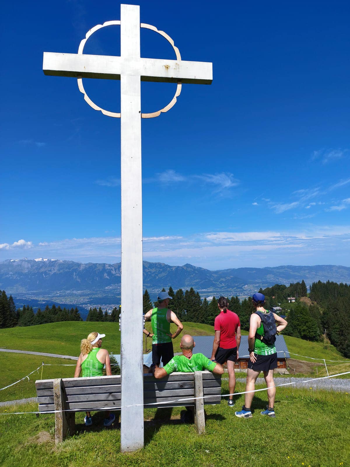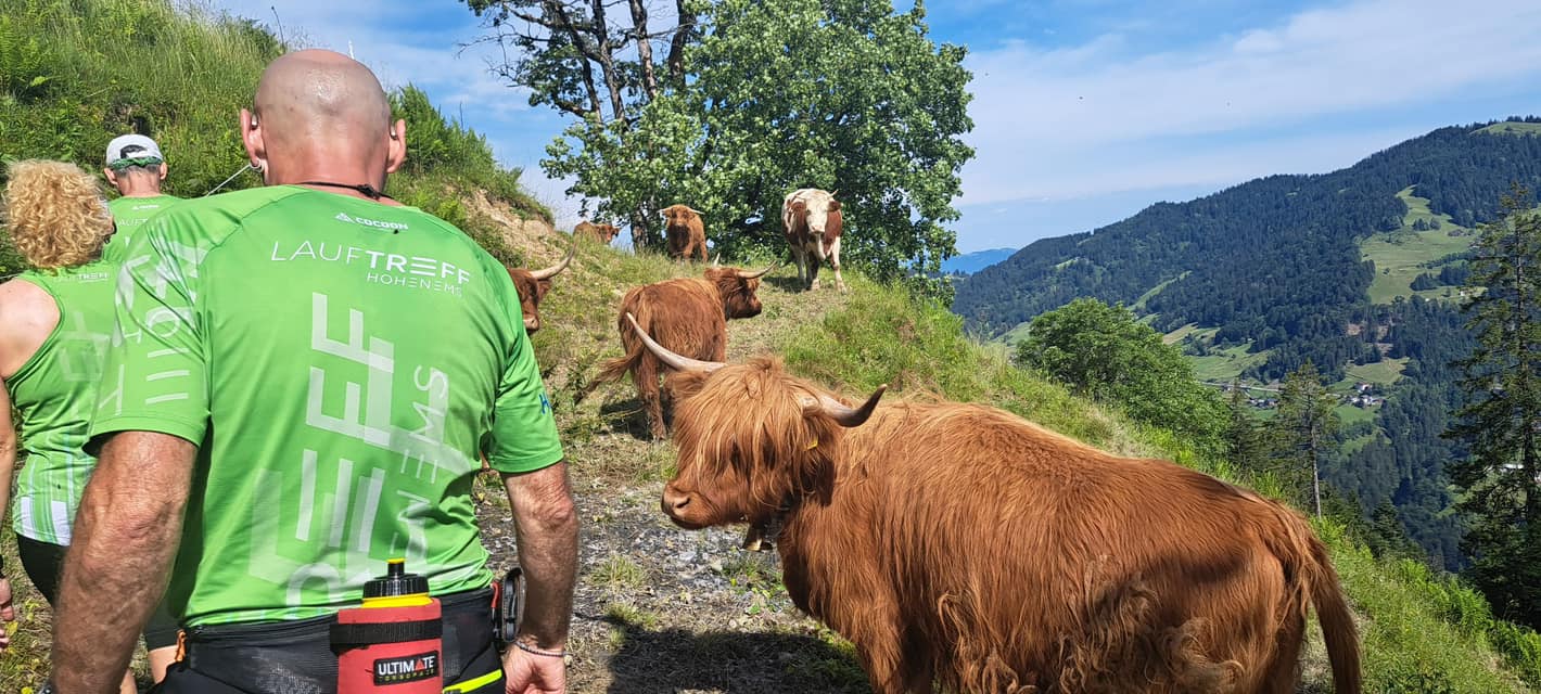 Im Juli luden uns Reini und Sabine zum Samstagslauf ein. Start und Ziel war in Übersaxen. Die Strecke verlief sehr abwechslungsreich über schmale Pfade und Forstwege und einige Kuhweiden, von denen aus sich ein wunderschöner Blick in die Berge bot. Am Wendepunkt konnten wir sogar den Piz Buin erblicken.